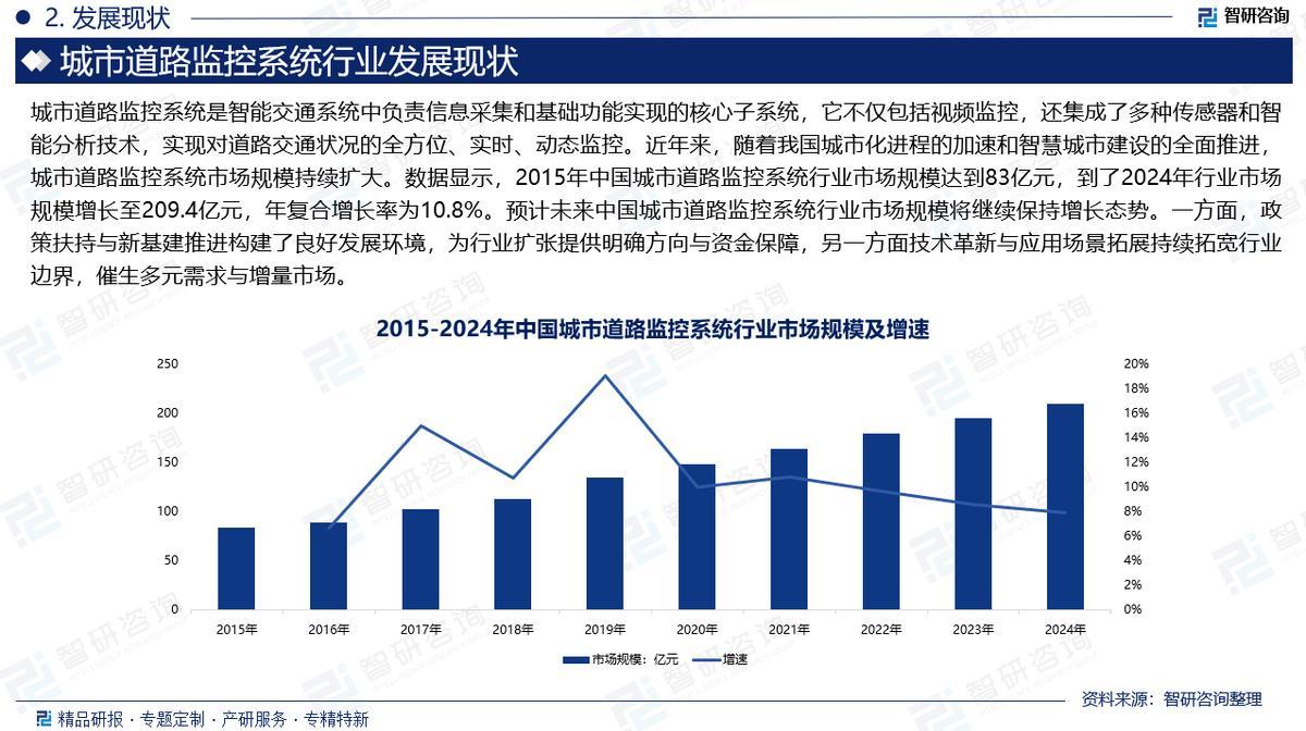 市场规模:近年来,随着我国城市化进程的加速和智慧城市建设的全面推进,城市道路监控系统市场规模持续扩大。数据显示,2015年中国城市道路监控系统行业市场规模达到83亿元,到了2024年行业市场规模增长至209.4亿元,年复合增长率为10.8%。