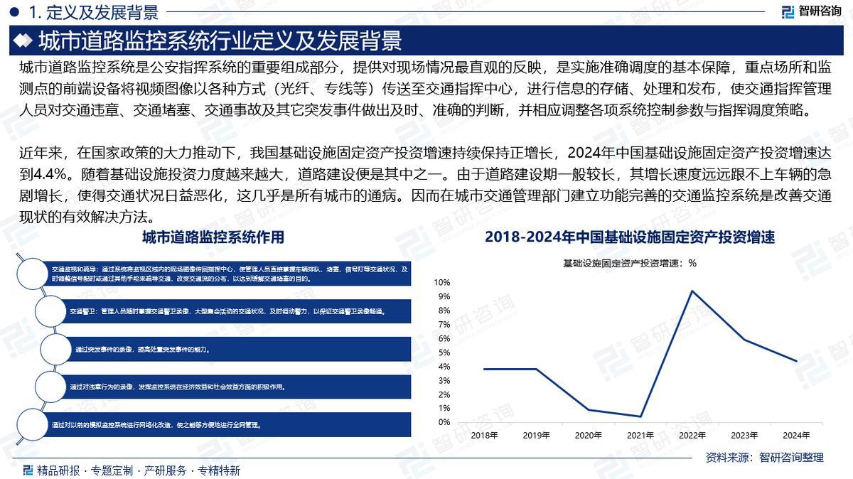 发展背景:近年来,在国家政策的大力推动下,我国基础设施固定资产投资增速持续保持正增长,2024年中国基础设施固定资产投资增速达到4.4%。随着基础设施投资力度越来越大,道路建设便是其中之一。由于道路建设期一般较长,其增长速度远远跟不上车辆的急剧增长,使得交通状况日益恶化,这几乎是所有城市的通病。因而在城市交通管理部门建立功能完善的交通监控系统是改善交通现状的有效解决方法。通过交通监控系统,可以加强交通管理,提高现有道路的通行能力,协调处理突发性交通事件,缓和交通阻塞,从而改善交通状况。