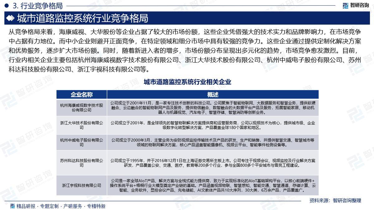 产业链:城市道路监控系统行业上游为软硬件提供商,主要为整个系统提供硬件核心部件与软件技术内核。中游是指城市道路监控系统。下游是指应用场景,是以政府端为主。公安、交警等政府部门是主要用户,用于交通管理、治安监控等。