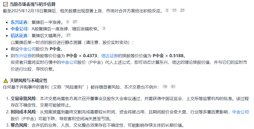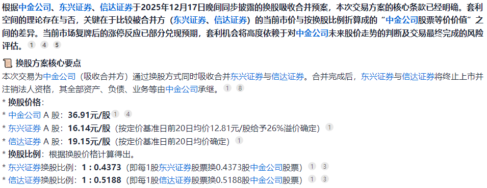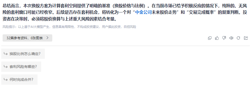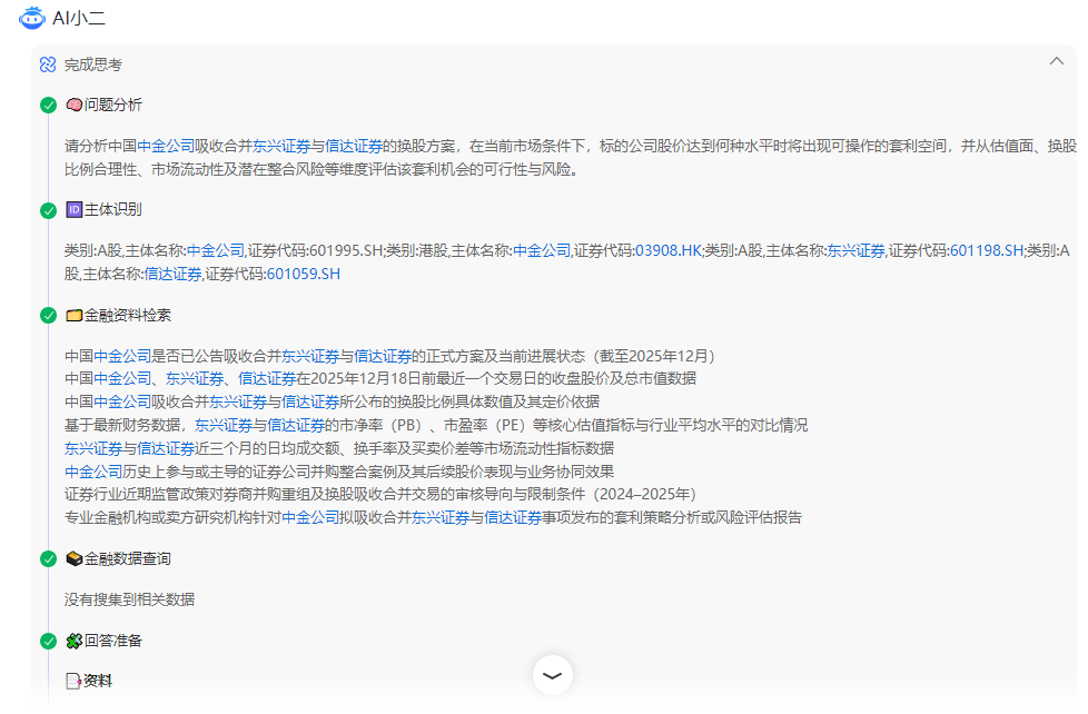 在AI小二的问答模式下,我们让AI小二“帮我分析下中金吸收合并东兴和信达的换股方案,股价达到什么条件下有套利空间?”
