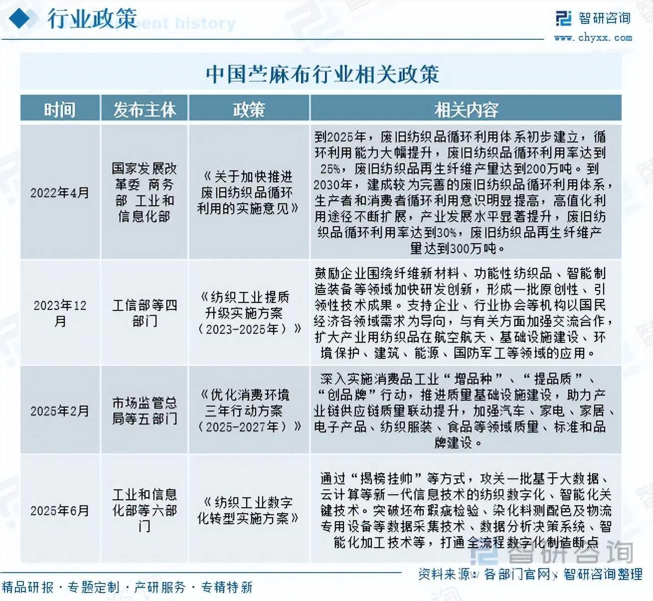 苎麻布是以“天然纤维之王”苎麻为核心原料,经脱胶、纺纱、织造等工艺制成的天然纺织品,凭借抑菌透气、吸湿快干、环保可降解等独特优势,广泛应用于服装、家纺、医疗、工业等多个领域,是我国极具特色的传统优势产业载体。近年来,我国出台《关于加快推进废旧纺织品循环利用的实施意见》《纺织工业提质升级实施方案(2023-2025年)》《优化消费环境三年行动方案(2025-2027年)》《纺织工业数字化转型实施方案》等政策,从绿色低碳发展、产业提质升级、消费市场培育、数字化转型赋能等多维度构建政策支撑体系,为苎麻布行业破解原料供应约束、突破技术瓶颈、拓展应用场景、提升国际竞争力提供了全方位政策保障,推动行业向高端化、智能化、绿色化、多元化方向高质量发展。
