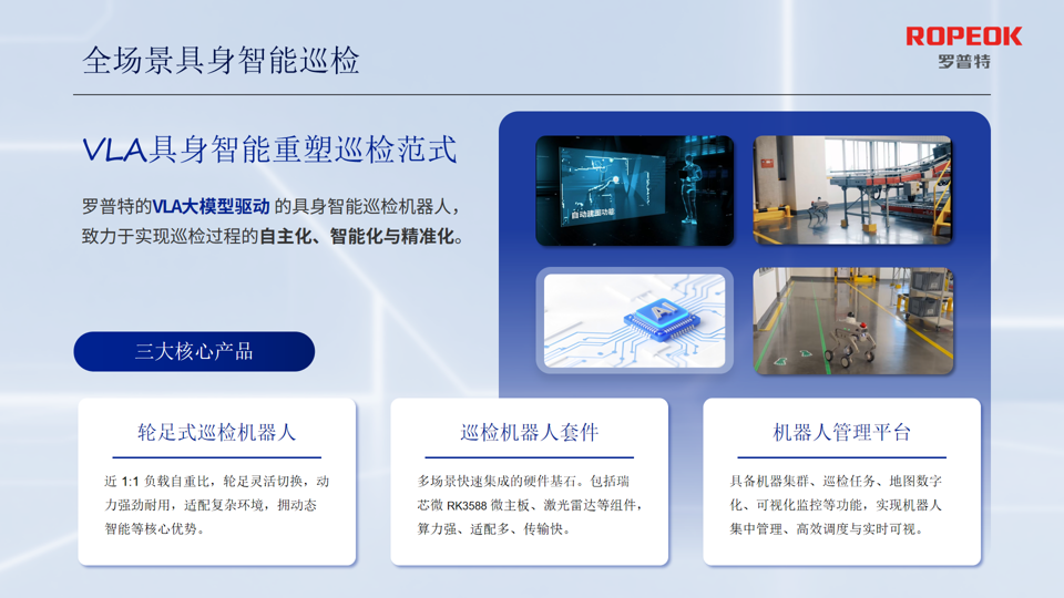 传统室内巡检长期受困于人工成本高、效率低、精准度不足等痛点,罗普特这款方案针对性破解行业难题。依托VLA大模型核心驱动力,方案通过三大产品协同发力,构建起全流程智能化巡检体系。
