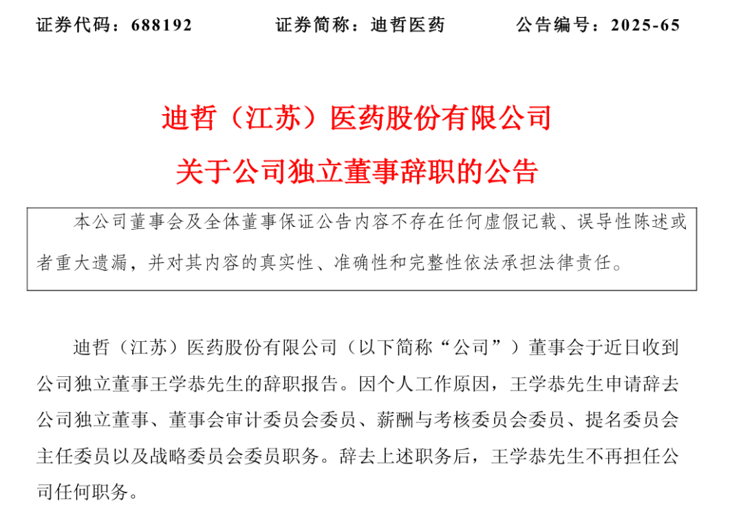 12月18日,迪哲医药发布公告,公司董事会于近日收到公司独立董事王学恭先生的辞职报告。因个人工作原因,王学恭先生申请辞去公司独立董事、董事会审计委员会委员、薪酬与考核委员会委员、提名委员会主任委员以及战略委员会委员职务。辞去上述职务后,王学恭先生不再担任公司任何职务。