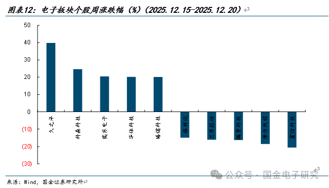从个股情况来看,12.15-12.20,久之洋、科森科技、奕东电子、华体科技、臻镭科技为涨幅前五大公司,涨幅分别为39.65%、24.49%、20.36%、20.01%、19.95%。跌幅前五为格林达、芯原股份、腾景科技、摩尔线程、富信科技跌幅分别为-14.87%、-16.06%、-16.22%、-18.50%、-20.39%。