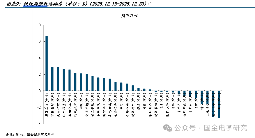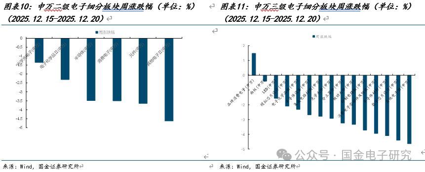回顾本周行情,参考申万一级行业划分,涨跌幅前三名的行业分别为商贸零售、非银金融、美容护理,涨跌幅分别为6.66%、2.90%、2.87%。涨跌幅后三位为机械设备、电力设备、电子,涨跌幅分别为-1.56%、-3.12%、-3.28%。本周电子行业涨跌幅为-3.28%。