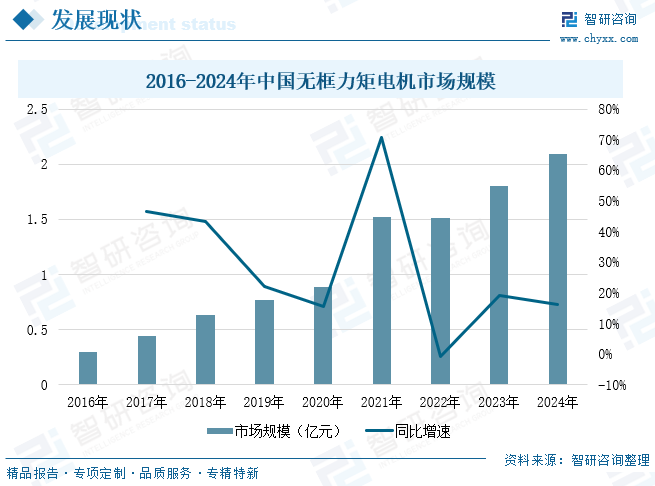 随着下游机器人行业逐步走向大规模商业化,无框力矩电机的需求量呈现出显著的增长态势,从而带动其市场空间持续扩张。2016-2024年期间,中国无框力矩电机市场规模由0.3亿元增长至2.09亿元,实现年复合增长率27.5%,未来市场规模将继续保持稳步增长态势。