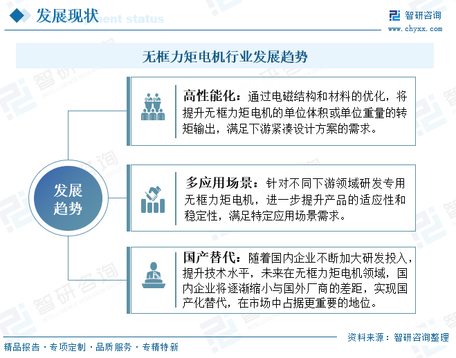 未来,随着下游行业加速发展,产品技术更新迭代,无框力矩电机将以高性能化、多应用场景发展。高性能化方面,通过电磁结构和材料的优化,将提升无框力矩电机的单位体积或单位重量的转矩输出,满足下游紧凑设计方案的需求。多应用场景方面,针对不同下游领域研发专用无框力矩电机,进一步提升产品的适应性和稳定性,满足特定应用场景需求。此外,随着国内企业不断加大研发投入,提升技术水平,未来在无框力矩电机领域,国内企业将逐渐缩小与国外厂商的差距,实现国产化替代,在市场中占据更重要的地位。