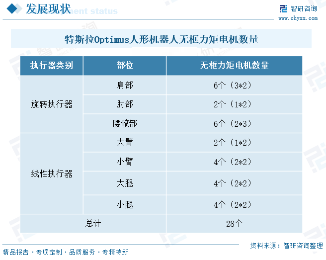 无框力矩电机因其特性与人形机器人关节的需求高度契合,已成为该领域的主流驱动方案。主要体现在:1)快速响应,指令信号至目标状态的转换时间达毫秒级,显著提升关节启停灵敏度,完美适配仿人运动所需的高频动作切换场景;2)高能量密度,通过磁路拓扑优化和铁芯结构精简,在同等体积下实现扭矩密度突破,满足关节空间受限下的高功率输出需求;3)空间适应性,支持深度嵌入式集成,可灵活适配从指关节到髋关节的全尺度定制化装配。以特斯拉Optimus人形机器人为例,特斯拉Optimus人形机器人28个关节执行器系统均以高功率密度无框力矩电机为核心驱动单元。其中,14个旋转关节由无框力矩电机+谐波减速器组成,模拟人体旋转自由度。另外,14个直线结构关节由无框力矩电机+行星滚柱丝杠组成,模拟人体线性伸缩肌群,如肱二头肌。旋转关节提供多向活动能力,直线执行器生成仿肌腱牵引力,为动态平衡与精细操作奠定硬件基础。优必选的人形机器人Walker X在全身关节部位安装了36个自研的高性能伺服舵机,其中包含无框力矩电机。国内企业优必选的人形机器人产品Walker X同样使用无框力矩电机作为一般关节的电机解决方案。Walker X在全身关节部位安装了36个自研的高性能伺服舵机,该伺服舵机是一体化驱动单元,由无框力矩电机、精密谐波减速器、驱动控制器及双编码器组成。