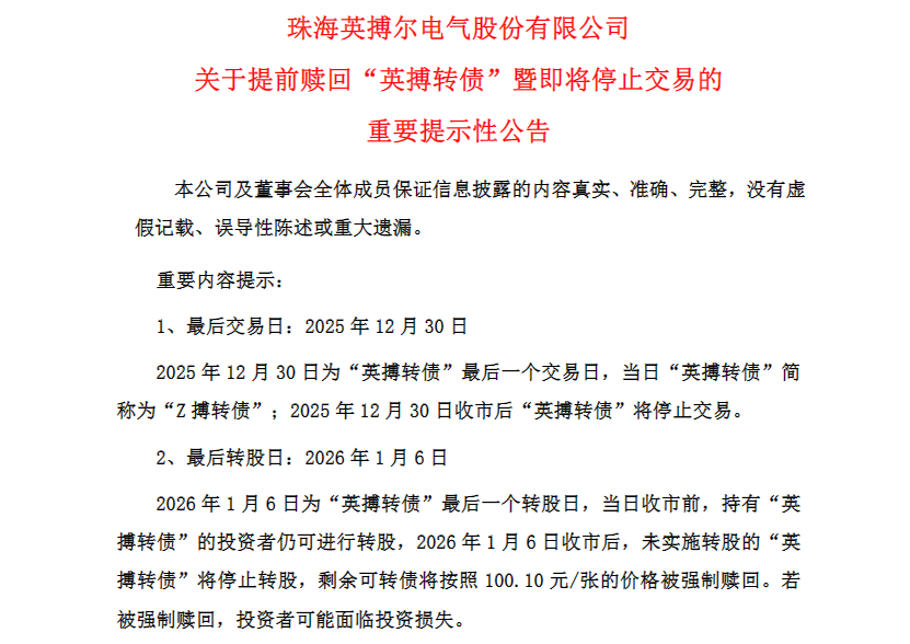 英搏尔发布关于提前赎回“英搏转债”暨即将停止交易的重要提示性公告,提醒投资者2025年12月30日为英搏转债最后一个交易日,2026年1月6日是最后一个转股日,债券持有人应及时卖出或转股。2026年1月6日收市后,未实施转股的英搏转债将全部冻结,停止交易和转股。