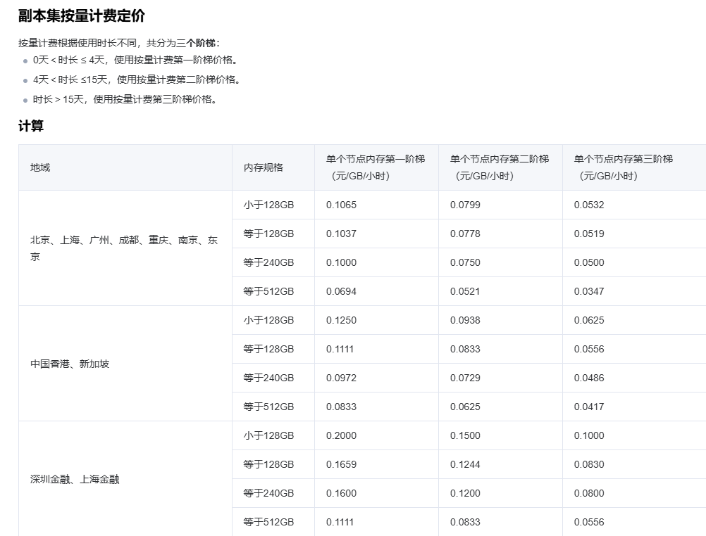 2)按量计费:后付费模式,在业务发展有较大波动性,且无法进行准确预测,或资源使用有临时性和突发性的情况下建议选择按量计费。用户在购买云数据库 MongoDB 时会冻结云账户中一个小时的硬件费用,并在每个整点(北京时间)进行一次结算,计费时间粒度精确到秒。在按量计费模式下,用户只需为云数据库 MongoDB 的实际使用量付费,不需要提前支付费用。举例来说,单节点按量计费定价,计算节点价格为0.1065- 0.0532元/GB/小时,存储节点价格为0.000972222元/GB/小时。