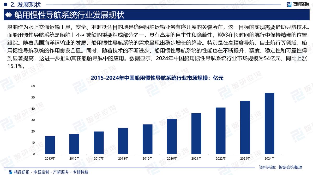 随着我国海洋运输业的发展,船用惯性导航系统的需求呈现出稳步增长的趋势。特别是在高精度导航、自主航行等领域,船用惯性导航系统的作用愈发凸显。同时,随着技术的不断进步,船用惯性导航系统的性能也在不断提升,精度、稳定性和可靠性得到显著提高,这进一步推动其在船舶导航中的应用。数据显示,2024年中国船用惯性导航系统行业市场规模为54亿元,同比上涨15.1%。