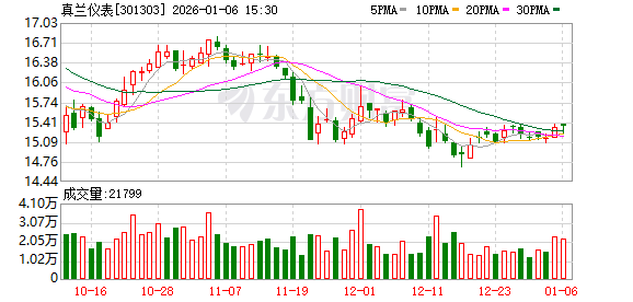 证券时报·数据宝统计显示,真兰仪表今日收盘价为15.34元,上涨0.13%,日换手率为2.14%,成交额为3335.15万元,全天主力资金净流入240.66万元,近5日该股累计上涨0.92%,近5日资金合计净流出46.65万元。