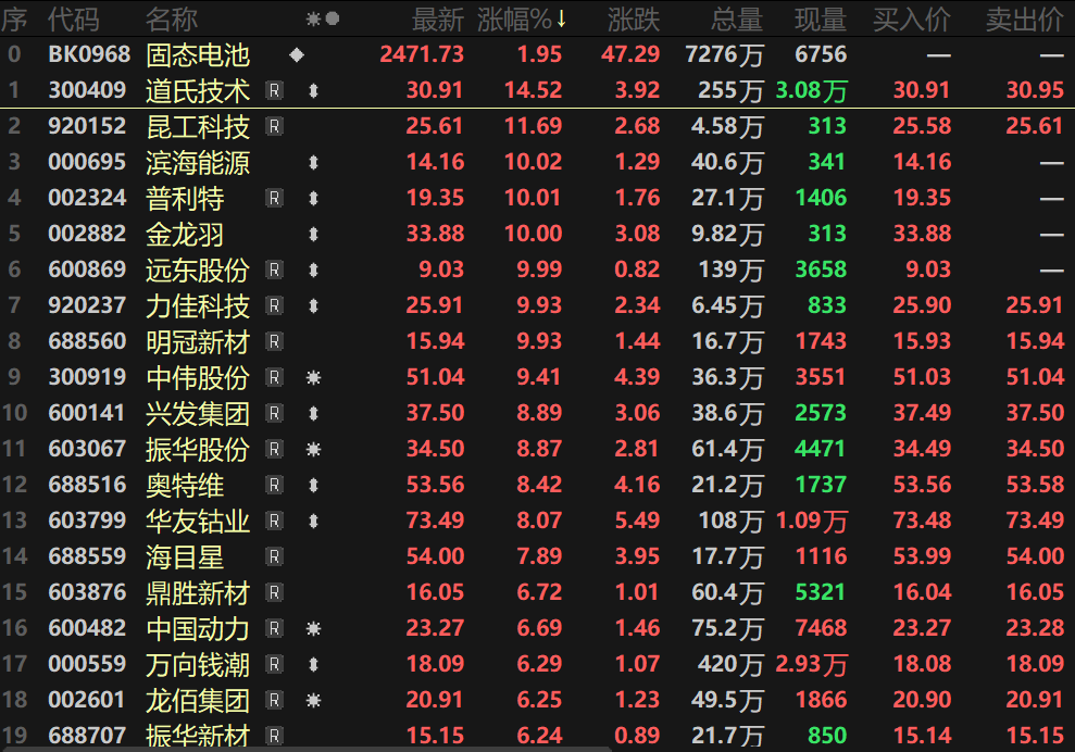 SMM 1月6日讯:2026年前两个交易日,固态电池板块持续活跃,今日指数盘中一度涨逾2%。个股方面,道氏技术(维权)、昆工科技等多股涨逾10%,滨海能源(维权)、普利特(维权)、金龙羽、远东股份等一同封死涨停板。