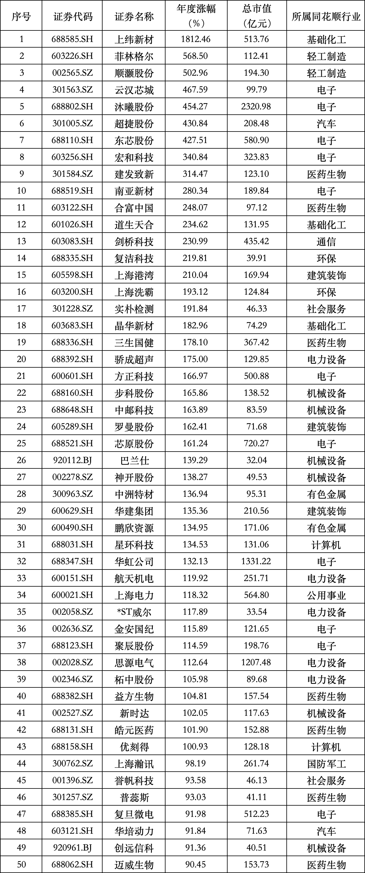 此外,云汉芯城、超捷股份全年涨幅均超过400%,宏和科技、建发致新等上市公司全年涨幅均超过300%。