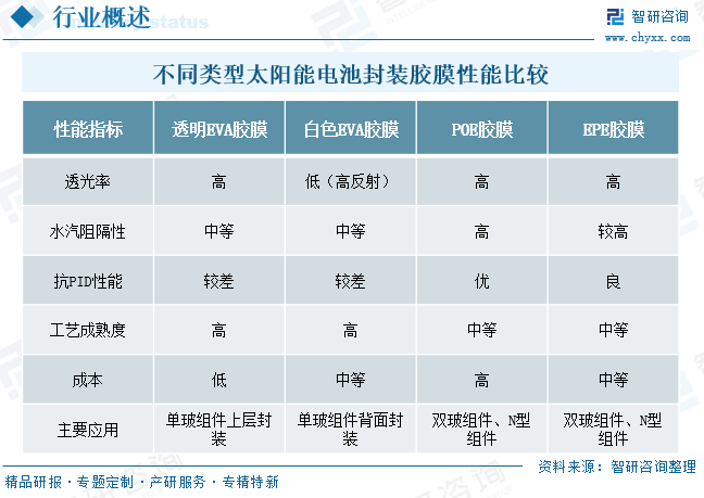 太阳能电池封装胶膜是一种用于光伏组件封装的高分子复合材料,主要应用于太阳能电池组件的层压封装工序。它能通过真空层压技术,将电池片与上层玻璃、下层背板(或玻璃)粘合为一体,既能保护脆弱的电池片免受外力和环境侵蚀,又能保证高透光率让阳光最大限度抵达电池片,同时提升组件的耐候性与耐久性,是保障光伏组件实现25年使用寿命的关键材料。目前市场主流的太阳能电池封装胶膜以EVA、POE和EPE三类为主。