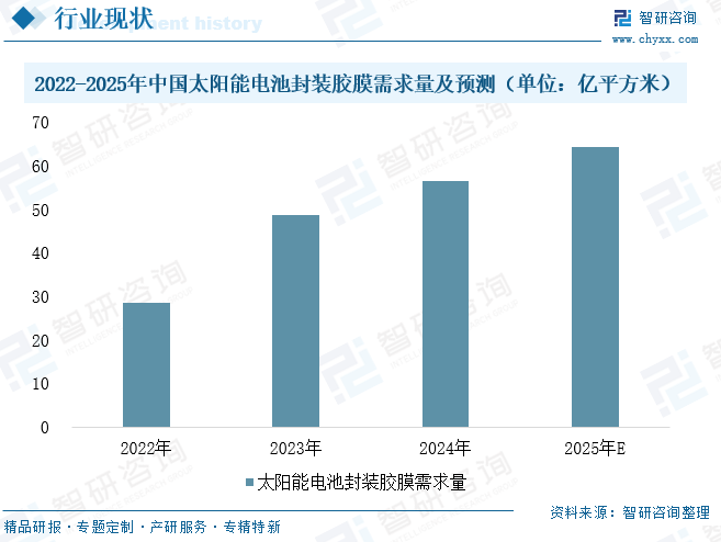 太阳能电池封装胶膜作为光伏组件的关键封装材料,其性能与可靠性直接决定了组件的发电效率与使用寿命。当前,中国太阳能电池封装胶膜行业在光伏产业高速发展的推动下,正处于政策支持与市场需求双轮驱动的发展阶段,市场规模持续扩大。数据显示,2022至2024年间,我国太阳能电池封装胶膜需求量从28.5亿平方米迅速增长至56.48亿平方米,年复合增长率超过40%,预计2025年整体需求量将突破60亿平方米,行业呈现强劲增长态势。