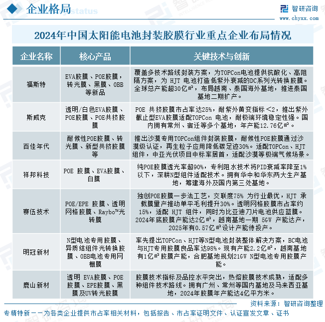 上游原材料供应格局持续优化,EVA树脂国产化体系已趋成熟,高端牌号进口依赖逐步降低。POE树脂作为关键瓶颈,国内企业正通过自主研发和技术合作突破生产壁垒,核心原料α-烯烃的国产化攻关同步推进,将有效缓解行业原料供应压力。中游胶膜企业与上下游联动愈发紧密,通过签订长协订单、共建研发平台等方式,稳定供应链并缩短技术转化周期。同时,头部企业加速海外产能布局,规避贸易壁垒的同时贴近海外组件制造基地,形成“原料-胶膜-组件”的全球化协同布局,进一步巩固中国企业的全球市场主导地位。