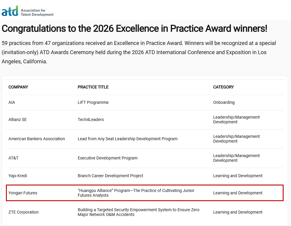 近日,人才发展领域最具权威性的国际奖项——“ATD 卓越实践奖”揭晓2026年获奖名单,公司《“黄埔联盟”计划——培养青年期货分析师》项目荣获“ATD卓越实践奖”。本次全球范围内仅有47个组织的59个实践项目获奖,获奖组织还包括中国电信、玛氏中国、中兴通讯等企业。