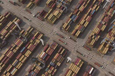 1月8日,宁波舟山港穿山港区集装箱码头货场一片繁忙(无人机照片)。记者近日获悉,2025年宁波舟山港完成货物吞吐量超14亿吨,连续17年位居全球第一,该港也由此成为全球首个年货物吞吐量超14亿吨的大港。