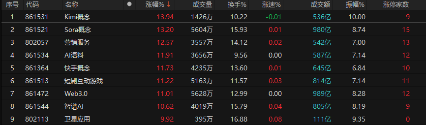 在多重“利好”叠加下,市场情绪被彻底点燃。当天,全市场共4144只个股上涨,其中201家涨停。各概念板块更是呈现普涨态势,AI应用、商业航天、人脑工程等板块掀起涨停潮,Kimi、Sora概念、AI语料、快手概念指数涨幅均超10%。