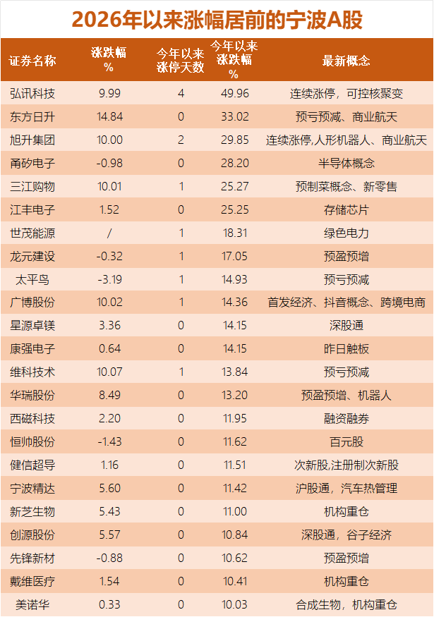 宁波A股方面,84家飘红,弘讯科技、旭升股份、广博股份、三江购物和维科技术5股涨停。
