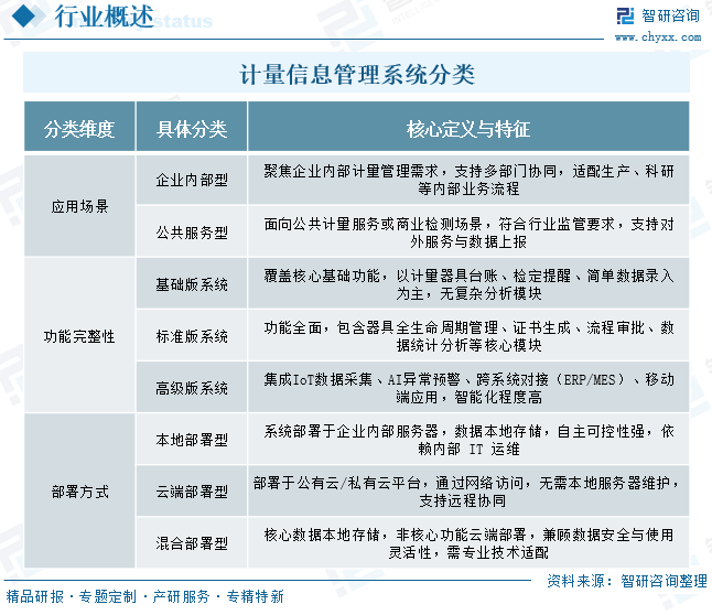 计量信息管理系统(MIMS)分类维度多元,按应用场景可分为服务企业内部质量管控与生产协同的企业内部型(如工业企业、科研机构专用系统)和面向公共计量服务与商业检测的公共服务型(如法定计量检定机构、第三方检测机构系统);按功能完整性可分为满足基础台账管理需求的基础版、覆盖全生命周期管理的标准版及集成IoT与AI技术的高级版;按部署方式则可分为保障数据自主可控的本地部署型、降低运维成本的云端部署型及兼顾安全与灵活性的混合部署型,各类分类均围绕不同用户群体的场景需求、功能诉求及安全偏好形成差异化适配。