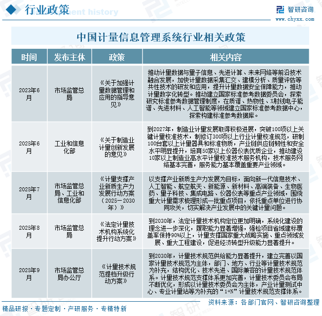 计量信息管理系统是支撑国家现代先进测量体系建设的核心数字化平台。近年来,我国持续推进计量体系与能力现代化,不断深化计量数据的系统性归集、智能挖掘与合规管理,充分发挥计量数据在推动高质量发展中的基础性、引领性作用。通过出台《关于加强计量数据管理和应用的指导意见》《关于制造业计量创新发展的意见》《计量支撑产业新质生产力发展行动方案(2025—2030年)》《法定计量技术机构系统化提升行动方案》《计量技术规范提档升级行动方案》等一系列针对性政策,从数据治理、产业赋能、机构改革与标准引领等多维度协同发力,为计量信息管理系统行业构建了清晰的政策框架与发展路径,推动其向标准化、智能化、服务化方向转型升级。