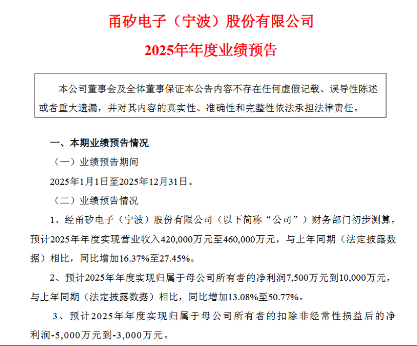 稍早之前,甬矽电子发布年度业绩预告,预计2025年实现营业收入42亿元至46亿元,同比增加16.37%至27.45%;预计2025年全年净利润为7500万元到1亿元,同比预增13.08%-50.77%;预计2025年全年扣非后的净利润为-5000万元到-3000万元。