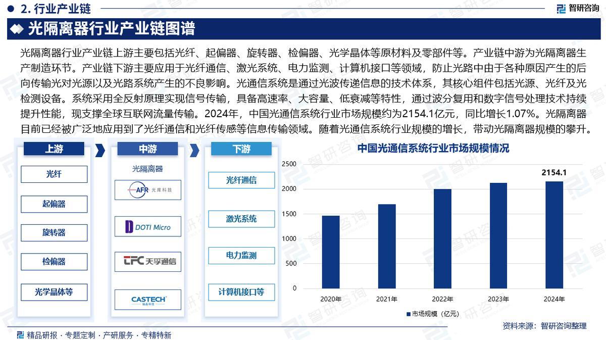 产业链核心节点:光隔离器行业产业链上游主要包括光纤、起偏器、旋转器、检偏器、光学晶体等原材料及零部件等。产业链中游为光隔离器生产制造环节。产业链下游主要应用于光纤通信、激光系统、电力监测、计算机接口等领域,防止光路中由于各种原因产生的后向传输光对光源以及光路系统产生的不良影响。