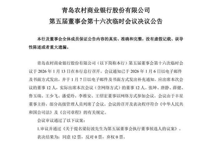 1月13日,青岛农村商业银行股份有限公司(以下简称“青农商行”)发布第五届董事会第十六次临时会议决议公告,会议审议并通过《关于提名梁衍波先生为第五届董事会执行董事候选人的议案》,该议案还需提交股东会审议。梁衍波的任职资格尚需报国家金融监督管理总局青岛监管局核准。