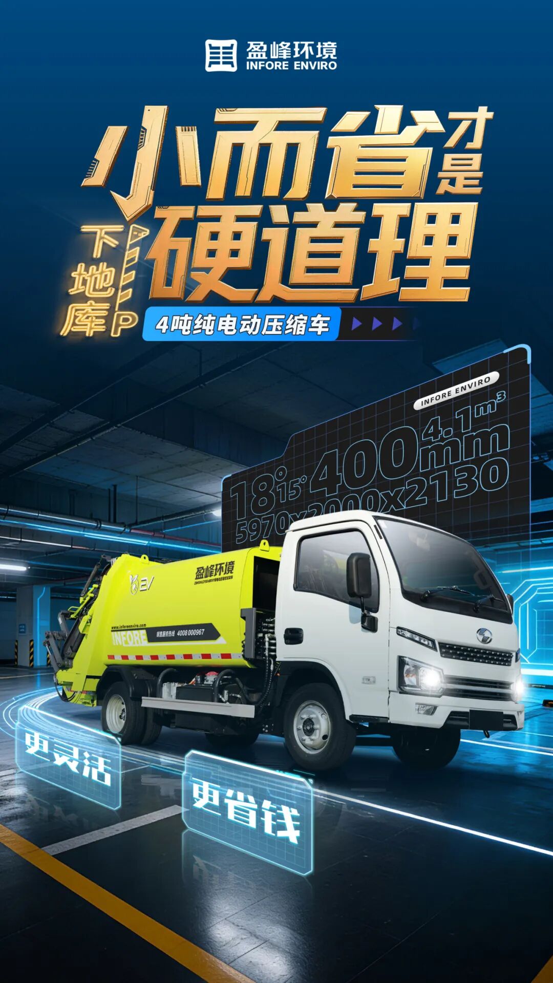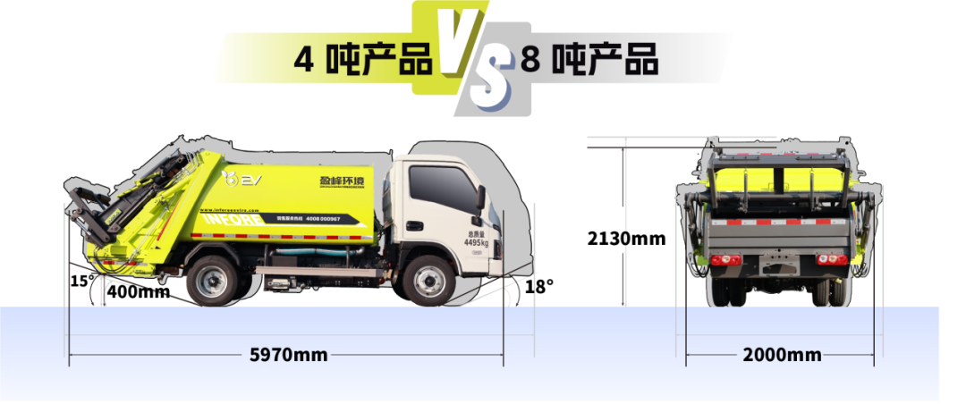 相比传统8吨地下车库产品,盈峰环境4吨纯电动压缩车在通过性上实现了全面优化。其车身设计更紧凑(长宽高5970×2000×2130mm),整体更短、更矮、更窄。在关键通过性参数上,车辆精益求精:拥有18°接近角与15°离去角,以及更高的填装器底部离地距离(400mm),并具备20%爬坡能力。