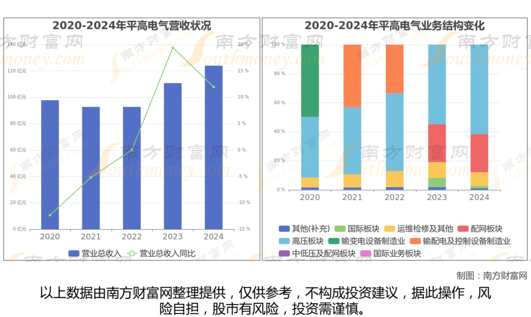 平高电气财务数据显示(如上图): 2024年实现营业总收入 124.02亿,同比增长11.96%。近五年复合增长率(CAGR)为6.11%。