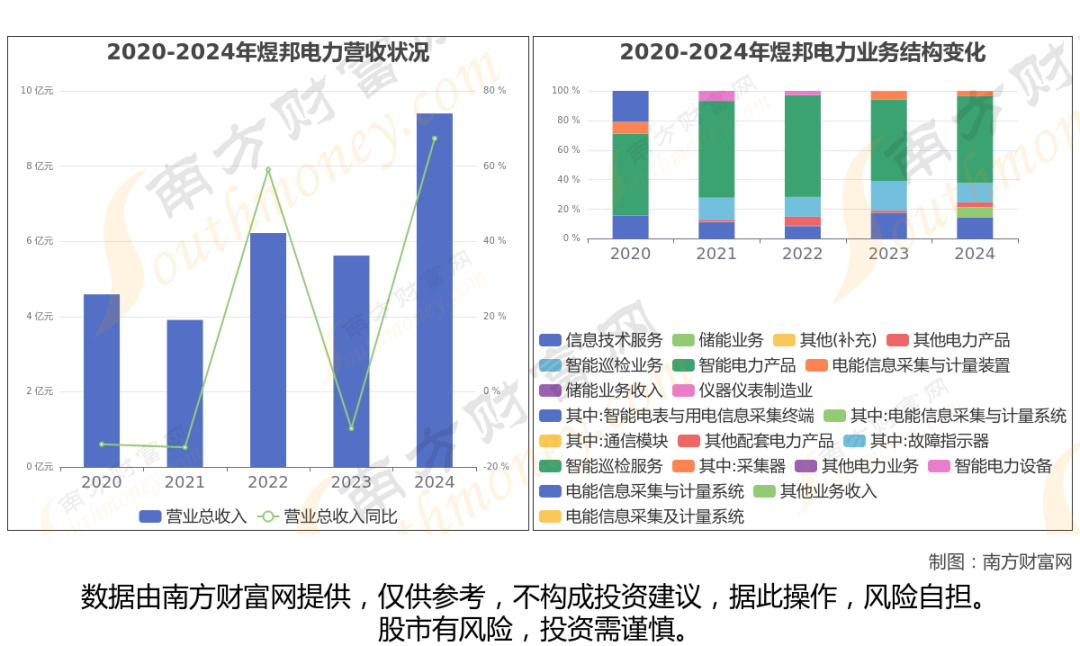 数据显示(如上图),煜邦电力2024年营业收入为9.4亿,同比增长67.35%,近5年复合年增长率19.62%。