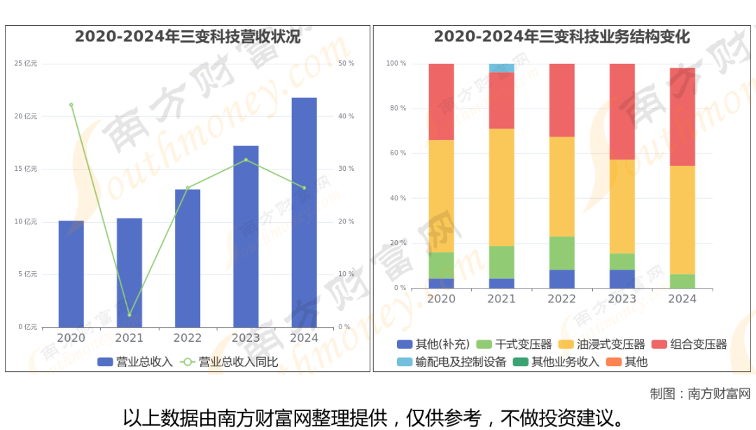 (如上图)2024年三变科技公司营业总收入为21.77亿,同比增长26.44%,近5年复合增长率为21.16%。