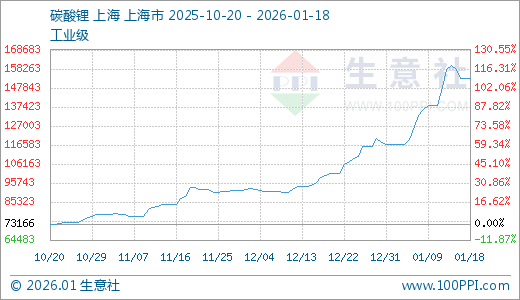据生意社监测,碳酸锂01月18日最新价格155000.00元/吨,最近10天上涨12.32%,15天上涨29.82%,30天上涨50.88%,60天上涨62.70%。