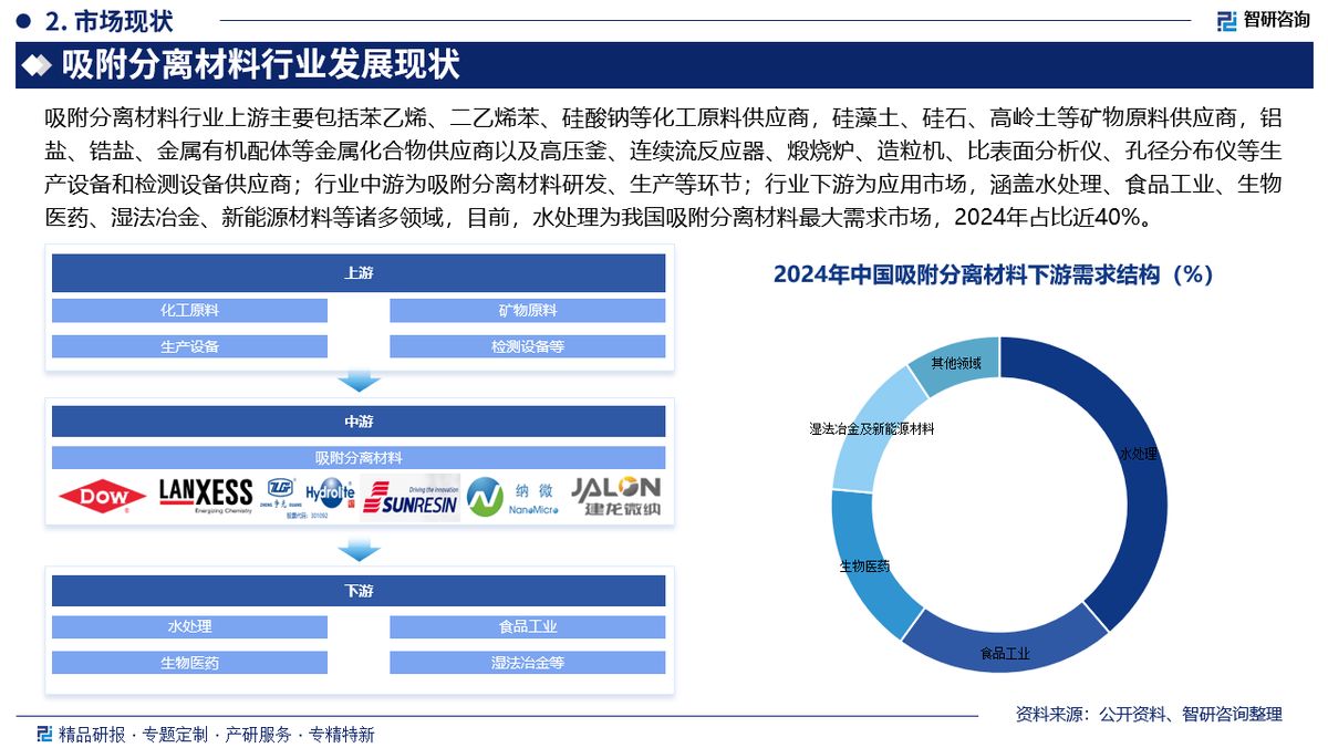 产业链核心节点:吸附分离材料行业上游主要包括苯乙烯、二乙烯苯、硅酸钠等化工原料供应商,硅藻土、硅石、高岭土等矿物原料供应商,铝盐、锆盐、金属有机配体等金属化合物供应商以及高压釜、连续流反应器、煅烧炉、造粒机、比表面分析仪、孔径分布仪等生产设备和检测设备供应商;行业中游为吸附分离材料研发、生产等环节;行业下游为应用市场,涵盖水处理、食品工业、生物医药、湿法冶金、新能源材料等诸多领域。