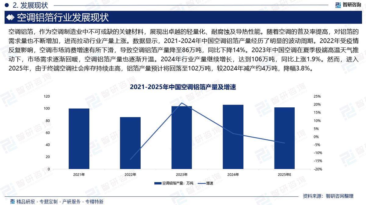 空调铝箔是指用于空调器热交换器翅片部分的专用铝箔,主要起到导热、抗腐蚀及结构支撑的作用。作为铝箔产业的重要细分市场,空调铝箔凭借其良好的导热性、耐蚀性和成形性,成为制造空调换热器的关键材料。随着空调的普及率提高,对铝箔的需求量也不断增加,进而拉动行业产量上涨。数据显示,2021-2024年中国空调铝箔产量经历了明显的波动周期。2022年受疫情反复影响,空调市场消费增速有所下滑,导致空调铝箔产量降至86万吨,同比下降14%。2023年中国空调在夏季极端高温天气推动下,市场需求逐渐回暖,空调铝箔产量也逐渐升温。2024年行业产量继续增长,达到106万吨,同比上涨1.9%。然而,进入2025年,由于终端空调社会库存持续走高,铝箔产量预计将回落至102万吨,较2024年减产约4万吨,降幅3.8%。