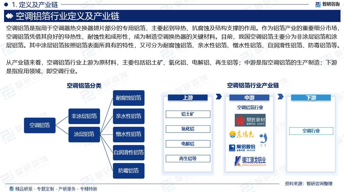 产业链:从产业链来看,空调铝箔行业上游为原材料,主要包括铝土矿、氧化铝、电解铝、再生铝等;中游是指空调铝箔的生产制造;下游是指应用领域,即空调行业。