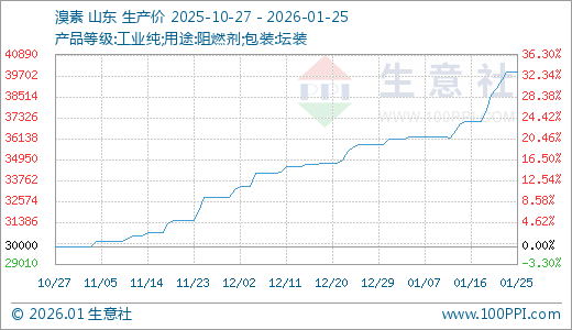据生意社监测,溴素01月25日最新价格39900.00元/吨,最近5天上涨3.37%,10天上涨7.55%,15天上涨10.04%,30天上涨11.45%,60天上涨21.65%。