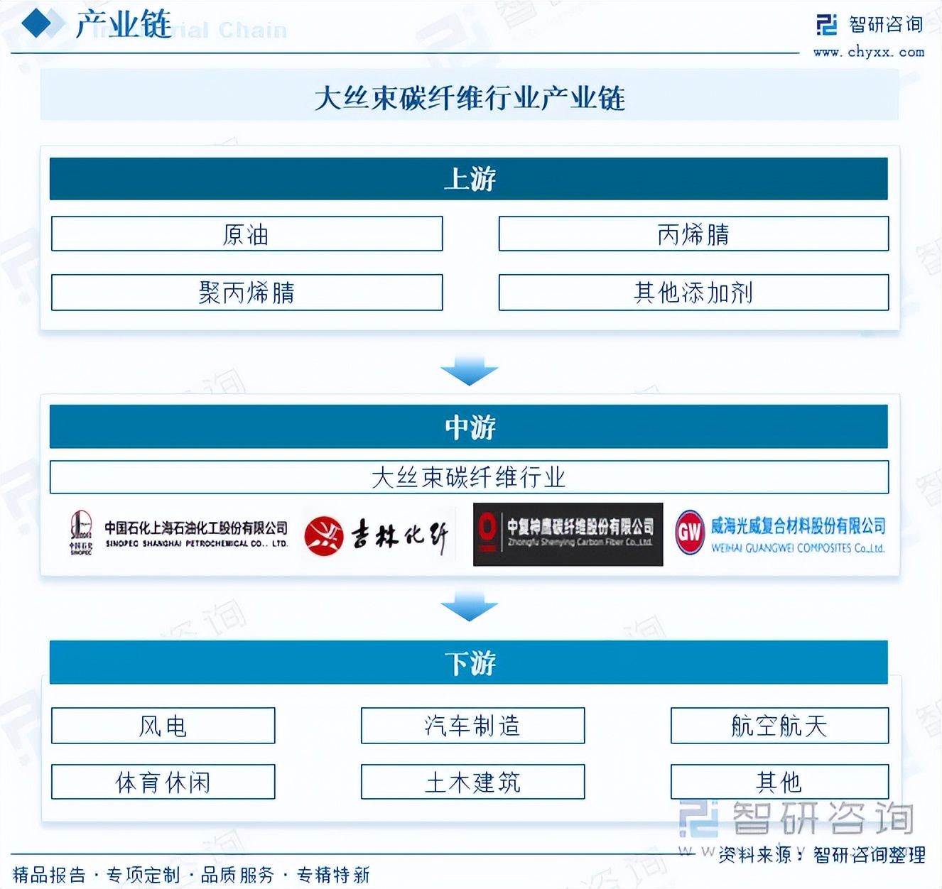 从产业链来看,大丝束碳纤维行业上游原材料主要包括原油、丙烯腈、聚丙烯腈、其他添加剂等;中游是指大丝束碳纤维的生产;下游是指应用领域,包括风电、汽车制造、航空航天、体育休闲、土木建筑等。