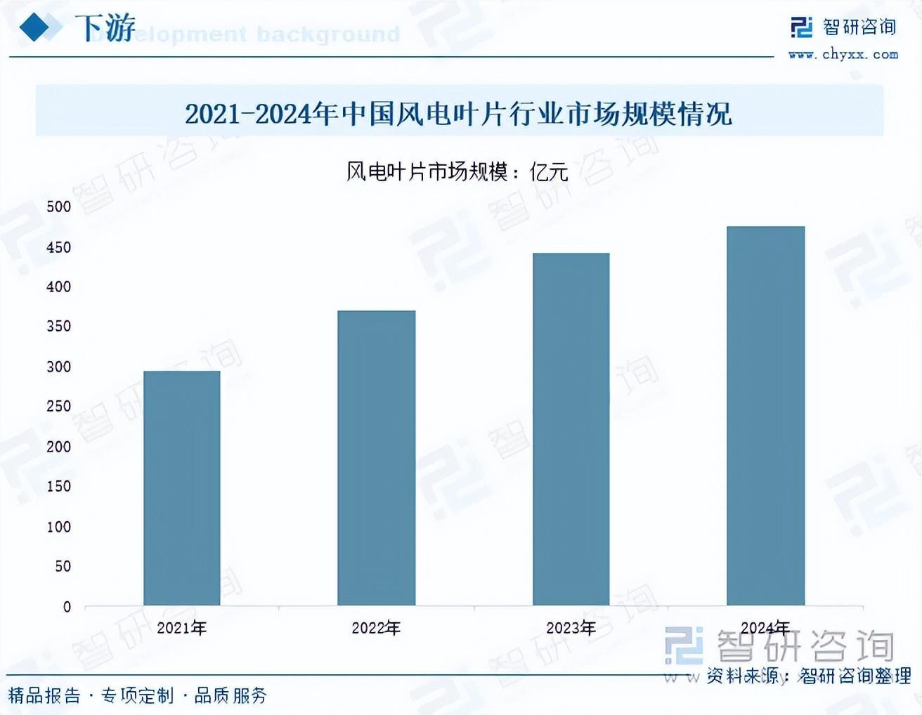 大丝束碳纤维主要应用于风电叶片。风电叶片为风机的关键构件,主梁为叶片的核心,其主要由增强材料构成。目前,构成叶片主梁的增强材料主要有碳纤维增强复合材料(CFRP)和玻璃纤维增强复合材料(GFRP)。传统的风电叶片是以玻璃纤维增强复合材料为主材制造,但玻璃纤维材料密度大于碳纤维,同时力学性能尤其是模量远低于碳纤维复合材料。为了避免大尺寸风电叶片在受力变形后与支撑柱产生碰撞,就需要采用质量轻、强度高、模量高的碳纤维增强复合材料来制造叶片。近年来,随着我国风电装机容量的不断增长,风电叶片的市场规模也随之扩大。2024年中国风电叶片市场规模达到476亿元,同比上涨7.7%。这意味着碳纤维增强复合材料的需求不断增加。而在风电叶片大型化趋势下,大丝束碳纤维相对于小丝束,优势更加明显。它能够在相同的生产条件下,提高碳纤维单线产能和质量性能,同时实现生产低成本化,这将有利于推动其在风电叶片的广泛应用。