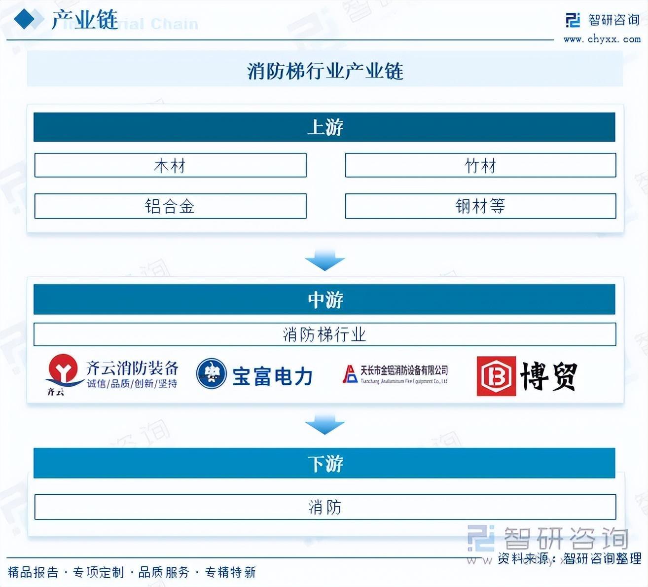 从产业链来看,消防梯行业上游原材料包括木材、竹材、铝合金、钢材等,这些材料直接影响消防梯的强度、安全性与成本。中游是指消防梯的生产制造。下游是指消防梯的应用领域,即消防领域。