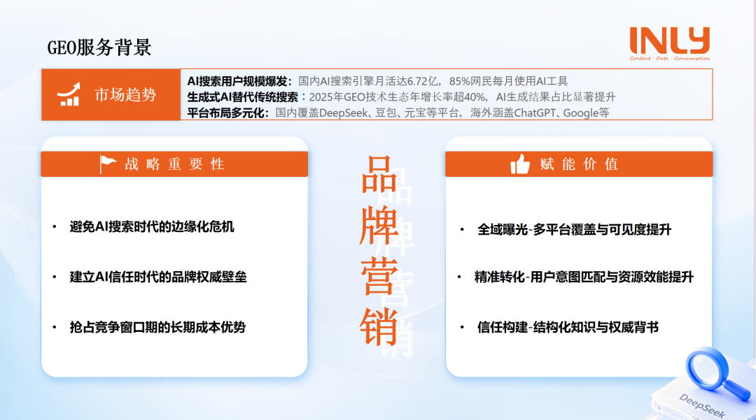 用户不再通过搜索引擎、信息流广告或平台内容主动检索品牌,而是越来越多地通过AI助手完成信息筛选、方案对比与决策推荐。这意味着,品牌的竞争不再只是“被用户看到”,而是升级为“被AI理解、推荐与采纳”。在这一背景下,GEO(Generative Engine Optimization,生成式引擎优化)成为企业营销体系中的新基础设施,而非单点战术工具。