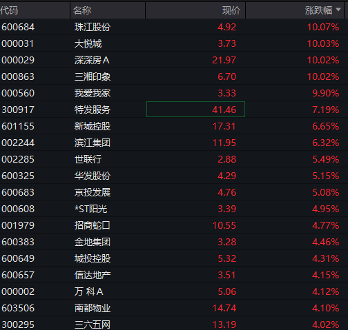 AI应用方向涨势扩大,新华网、人民网、因赛集团、引力传媒、粤传媒、科大讯飞、浙文互联等10余股封涨停板,A股和港股的房地产板块盘中走强,其中珠江股份、大悦城、深深房A、三湘印象涨停。港股方面,融创中国涨超21%,中国奥园、佳兆业集团、碧桂园、旭辉控股集团、世茂集团涨幅均超过10%。