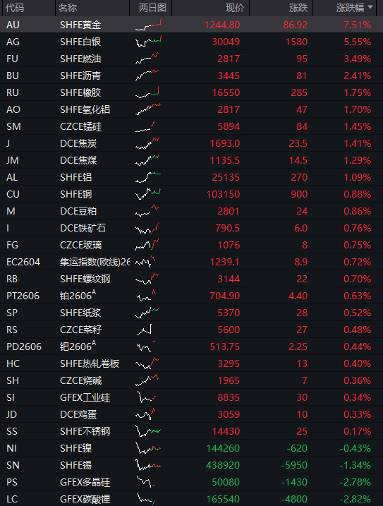 债市方面,国债期货全线上涨,30年期国债期货合约上涨0.3%。商品方面,国内商品期货大面积上涨,沪金暴涨超7%。核心市场走势: