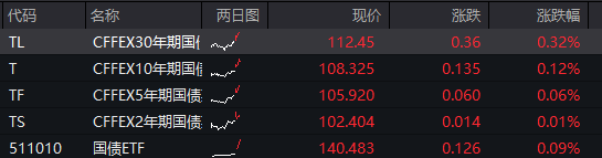债市:国债期货全线上涨,截至发稿,30年期主力合约涨0.32%,10年期主力合约涨0.12%,5年期主力合约涨0.06%,2年期主力合约涨0.01%。