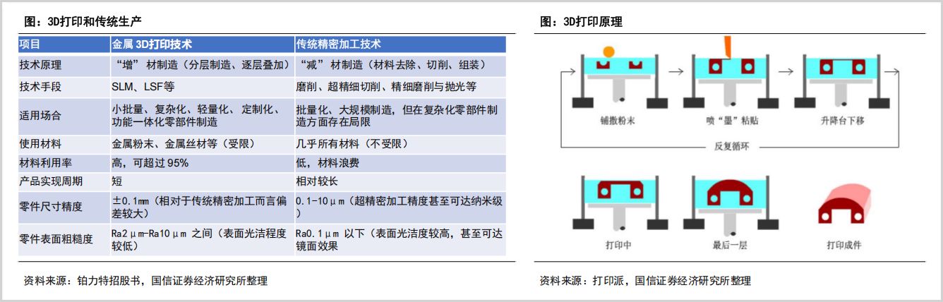 从制造工艺来看,传统的工业制造属于减材制造,通过削、刨、铣等将原始材料削减加工为所需形状和尺寸,而制造形状复杂或大型结构件则存在加工成型难题,需要先加工成多个零部件再组装,不仅程序较多加工成本高,且材料利用率较低。