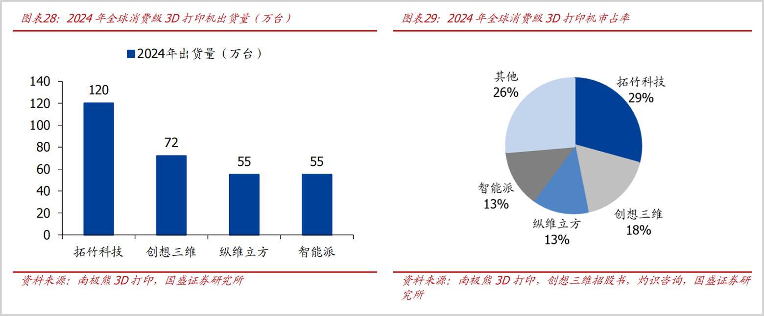 在竞争格局上,当前全球消费级3D打印市场主要由我国厂商主导,据国盛证券研究,按照出货量统计,2024年包括拓竹科技、创想三维、纵维立方以及智能派四大厂商占据了全球70%以上份额,其中拓竹科技作为龙头占比达29%,但目前四家企业均未上市。