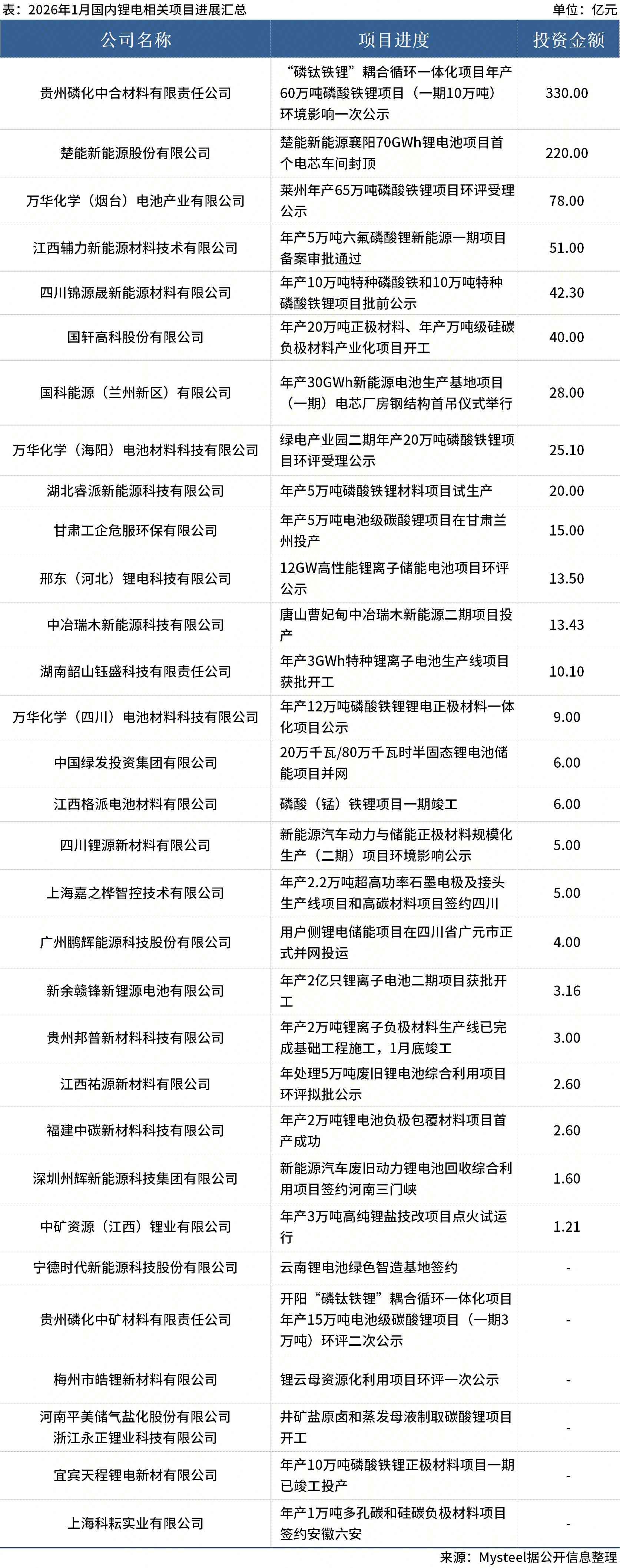据Mysteel不完全统计,2026年1月国内31个锂电相关项目公布签约、投产和环评审批等情况,涉及项目投资约935.6亿元。其中中矿资源年产3万吨高纯锂盐技改项目点火试运行;鹏辉能源携手四川中孚打造的全国最大用户侧锂电储能项目在四川省广元市正式并网投运。