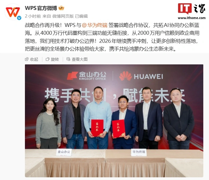 IT之家2月2日消息,WPS官方微博今日宣布与华为终端签署战略合作协议,宣称“2026年继续携手冲刺,让更多创新特性落地”。